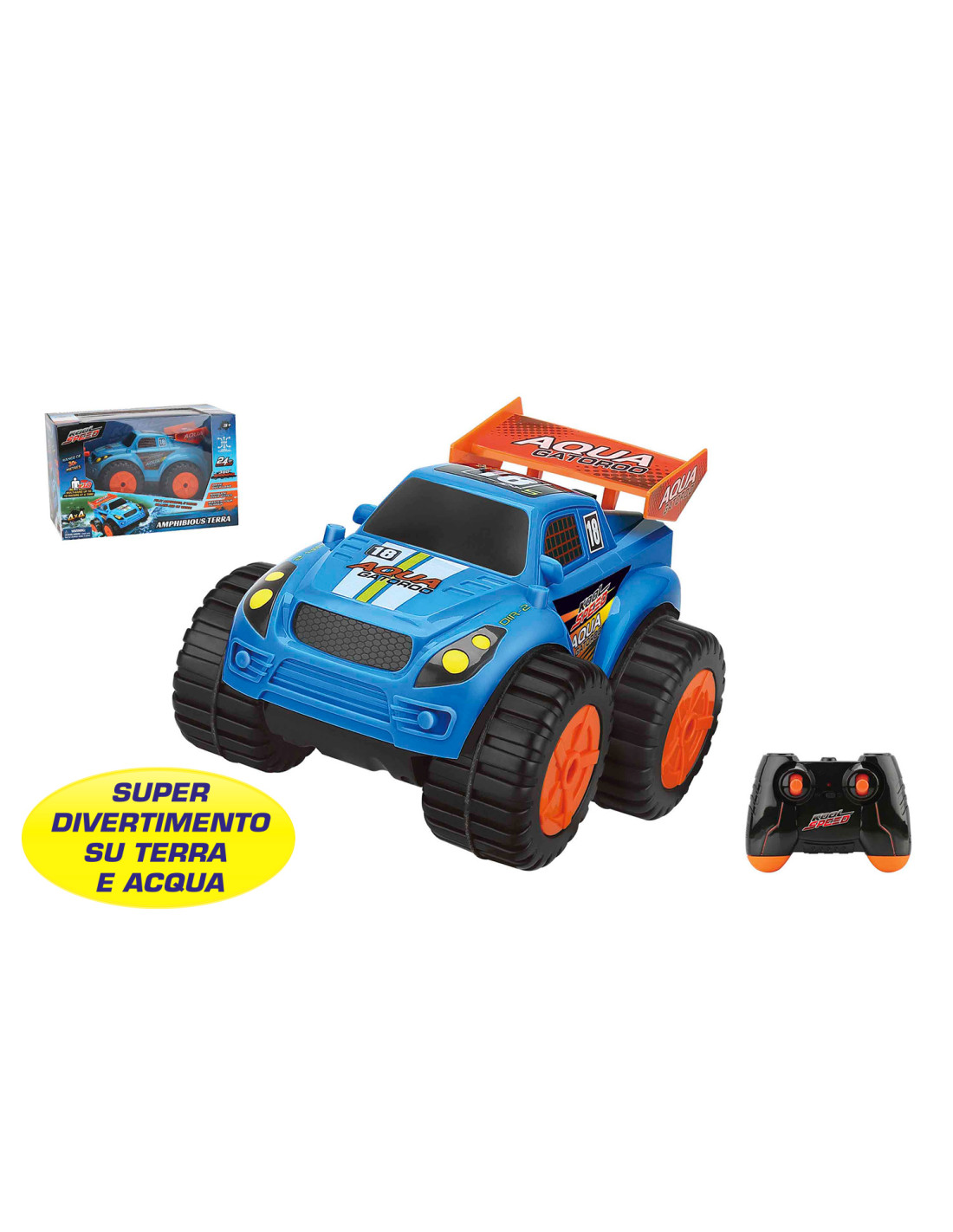 Auto RC anfibia Kool Speed 4×4, il fuoristrada più selvaggio! Guidalo a terra o in acqua e pratica le sue 6 funzioni di movimento prima della gara. Le ruote dell'auto sono sovradimensionate per una migliore presa. Il telecomando dell'auto è di tipo joystick e ha una frequenza di 2,4 GHZ per la modalità multiplayer. Raggiunge oltre i 30 mt e ruota di 360 o. Batterie non incluse.