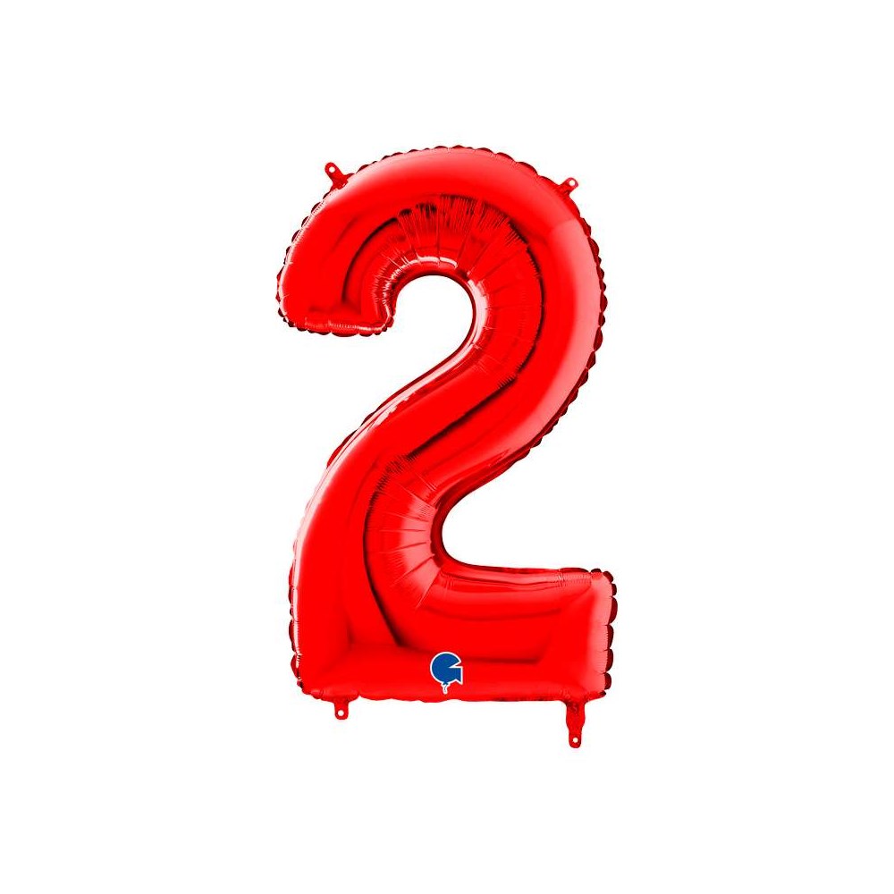 Palloncino in Mylar sagomato a forma di numero 2, di colore rosso, dimensioni 35 cm, dotato di valvola autochiudente.